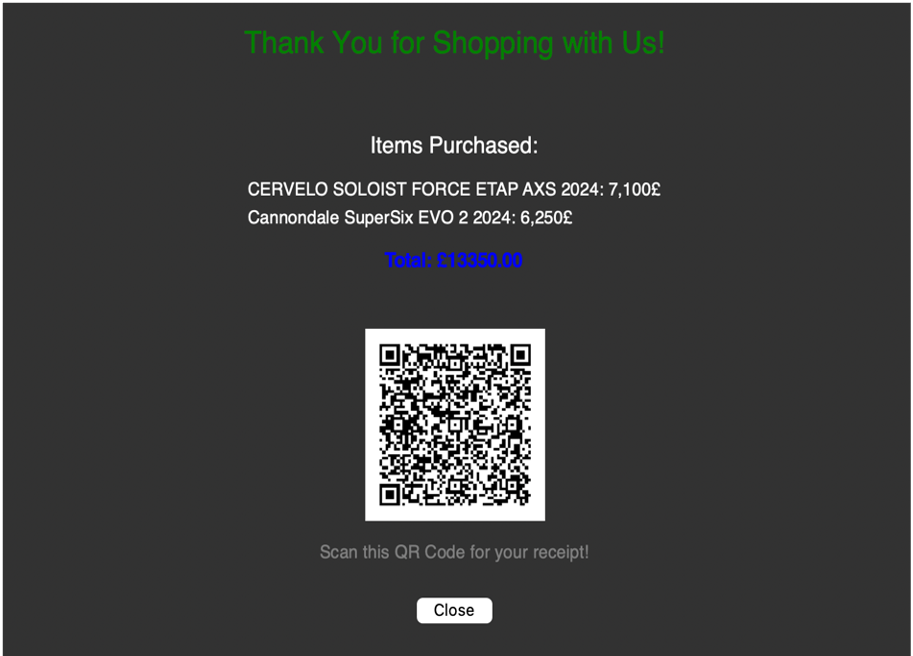This application has a QR code generator that prints QR codes that, when scanned, provide a digital receipt. This receipt includes the total cost and a thank-you message. This is coded using the Python QR code library.